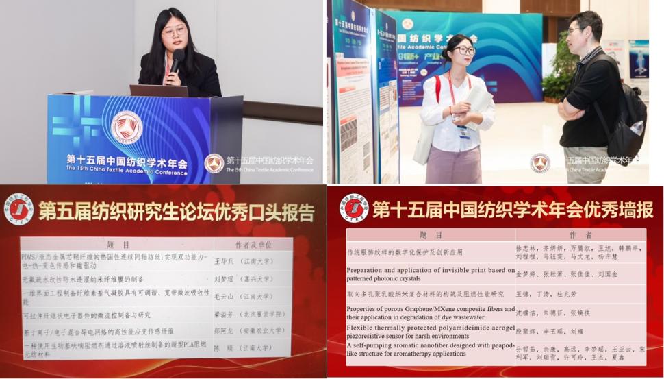 此外,我校研究生在本次年会中表现突出。2024届硕士研究生刘梦瑶以《无氟疏水改性防水透湿纳米纤维膜的制备》作口头报告,并获得了研究生论坛优秀口头报告。2023届硕士研究生沈楹洁的“多孔石墨烯/MXene复合纤维的性能及其在染料废水降解中的应用”墙报获评年会优秀墙报。