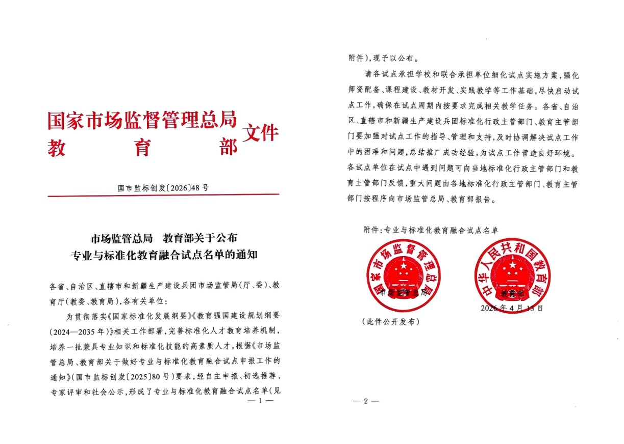 近日,国家市场监督管理总局、教育部联合印发《关于公布专业与标准化教育融合试点名单的通知》,我院轻化工程专业成功入选全国首批专业与标准化教育融合试点名单,成为学校人才培养改革的新方向。