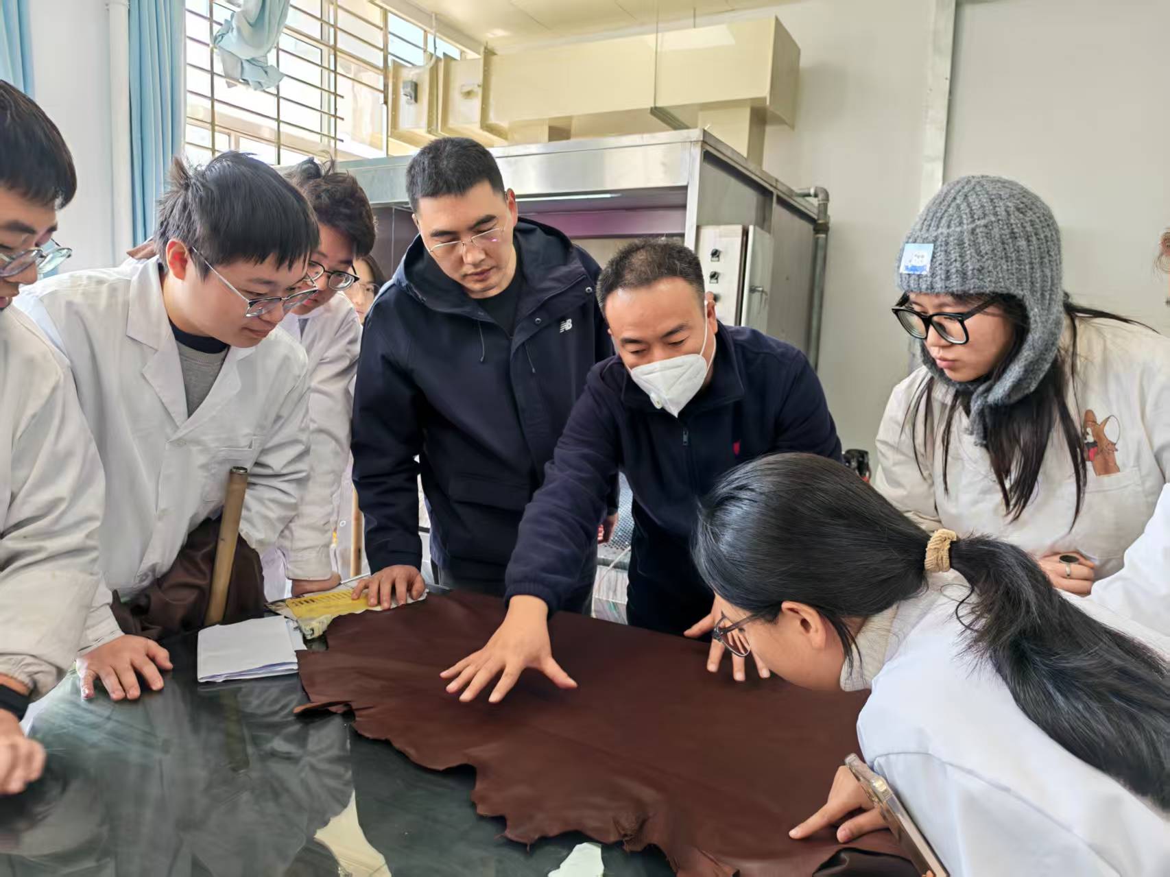 11月17日至21日,“黎宁科技皮革涂饰技术交流周”由山东黎宁新材料科技有限公司曾伟经理与刘力经理主讲。他们围绕皮革涂饰技术展开讲解,指导学生完成无金属鞣绵羊服装革与黄牛沙发革的涂饰工艺设计与实践,成功生产出市场流行风格真皮面料。在分组分享环节,学生就实践中所遇问题与教师展开现场讨论。